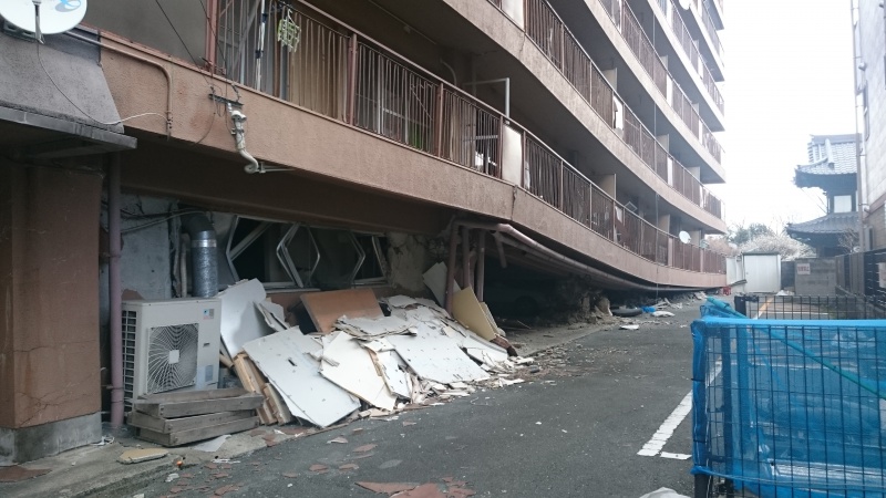 アパートの1階駐車場がつぶれて車も下敷きのままです。
